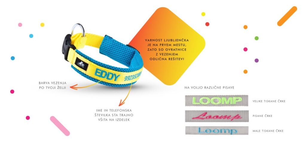 Ti včasih nadebudni raziskovalec pobegne in ga v strahu in paniki iščeš pri sosedih in po bližnjih poljih? Pri Loompu poskrbimo tudi za to. Na izdelke ti lahko izvezemo ime in telefonsko številko, ki bo rešila problem v primeru, če odtava v sosednjo vas k ljubčku ali ljubici. Tako ga najditelj lahko hitro vrne nazaj domov, tebi pa prihrani skrbi in kakšen siv las.
